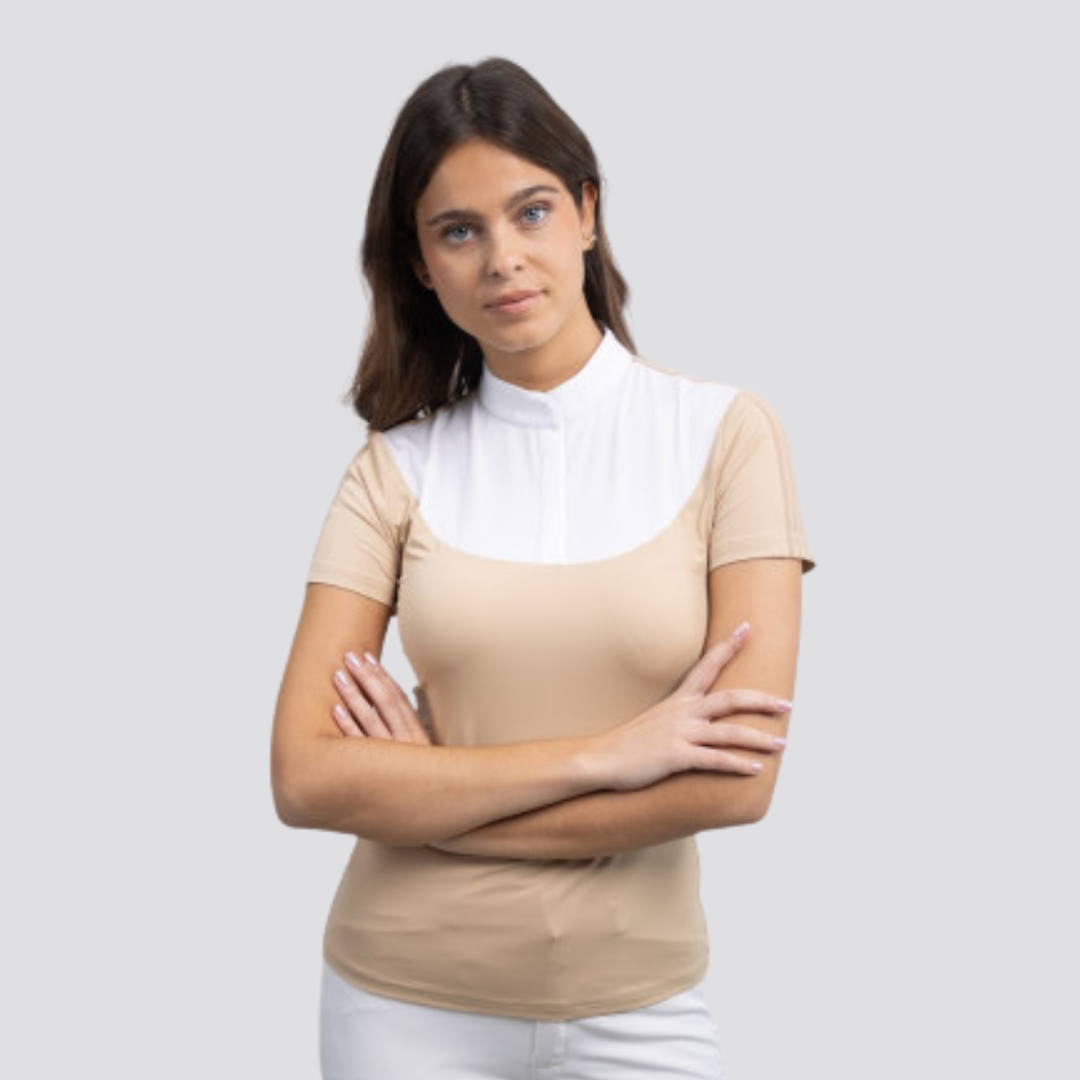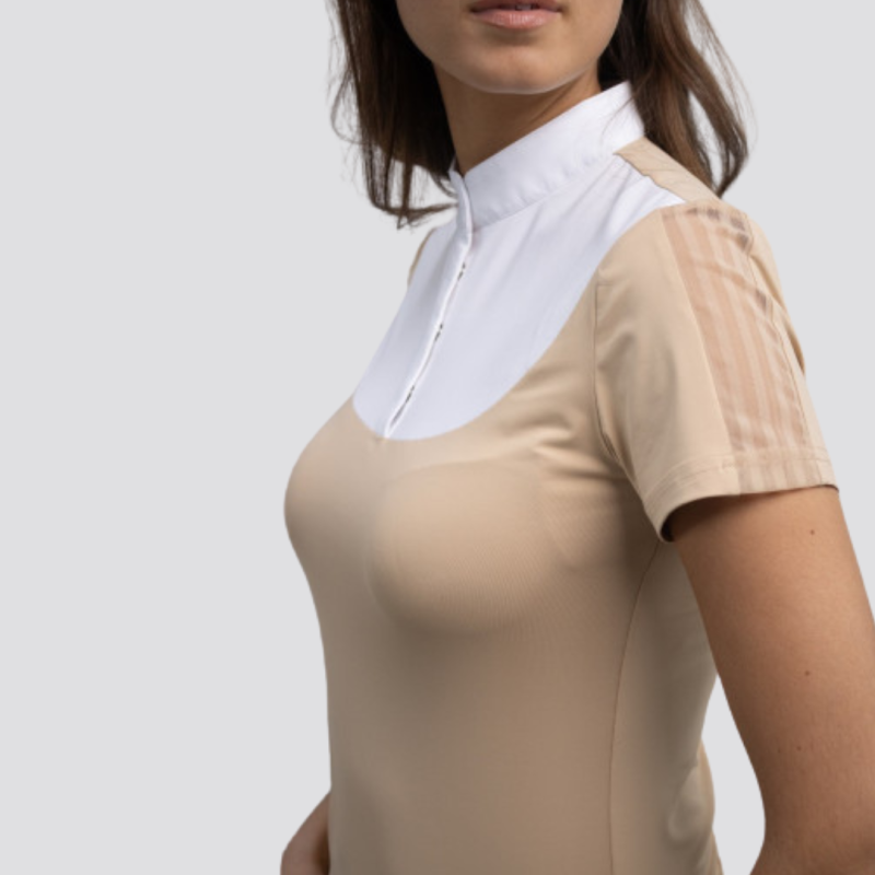 Polo de concours femme Harcour, taillé avec élégance pour une silhouette cintrée et sophistiquée. Doté d'une fermeture par trois boutons à pression, et d'un col montant aimanté pour une fermeture facile. Les boutons argentés Harcour ajoutent une touche d'élégance discrète à l'arrière du col. Fabriqué en matière mech rayée ton sur ton sur le dessus des manches, composé de 92% de polyamide et 8% d'élasthanne, offrant confort et liberté de mouvement pendant les compétitions
