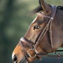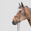 Le bridon HFI offre un confort exceptionnel avec sa têtière anatomique, son frontal et sa muserolle rembourrés, doublés de cuir souple. Il se distingue par ses broderies et empiècements décoratifs, ses surpiqûres crème, et ses rênes 1/2 en caoutchouc souple, alliant style et fonctionnalité