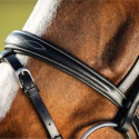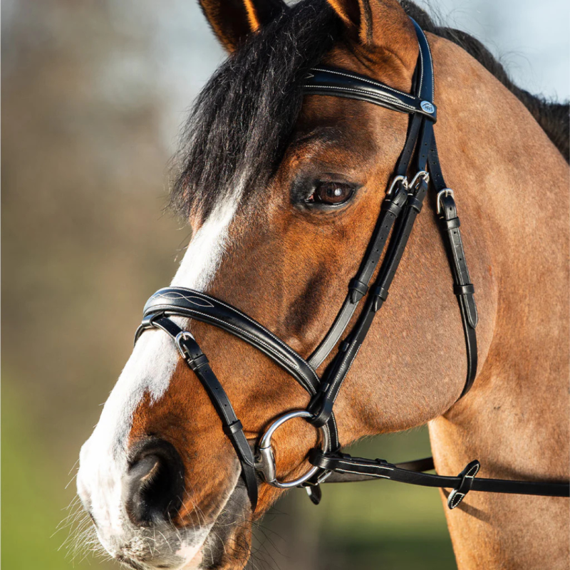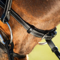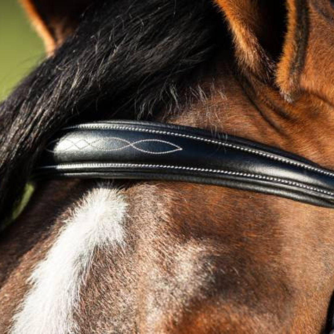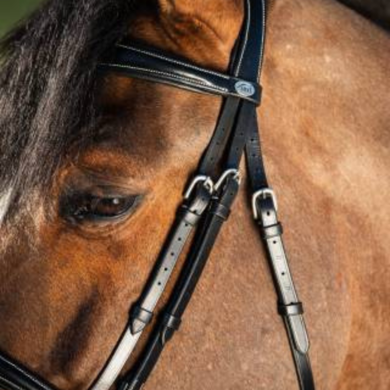 Le bridon HFI est conçu pour offrir un confort supérieur avec sa têtière anatomique et ses parties rembourrées doublées de cuir souple. Son frontal et sa muserolle ornés de broderies décoratives, ainsi que ses surpiqûres crème et ses rênes 1/2 en caoutchouc souple, allient élégance et fonctionnalité