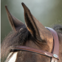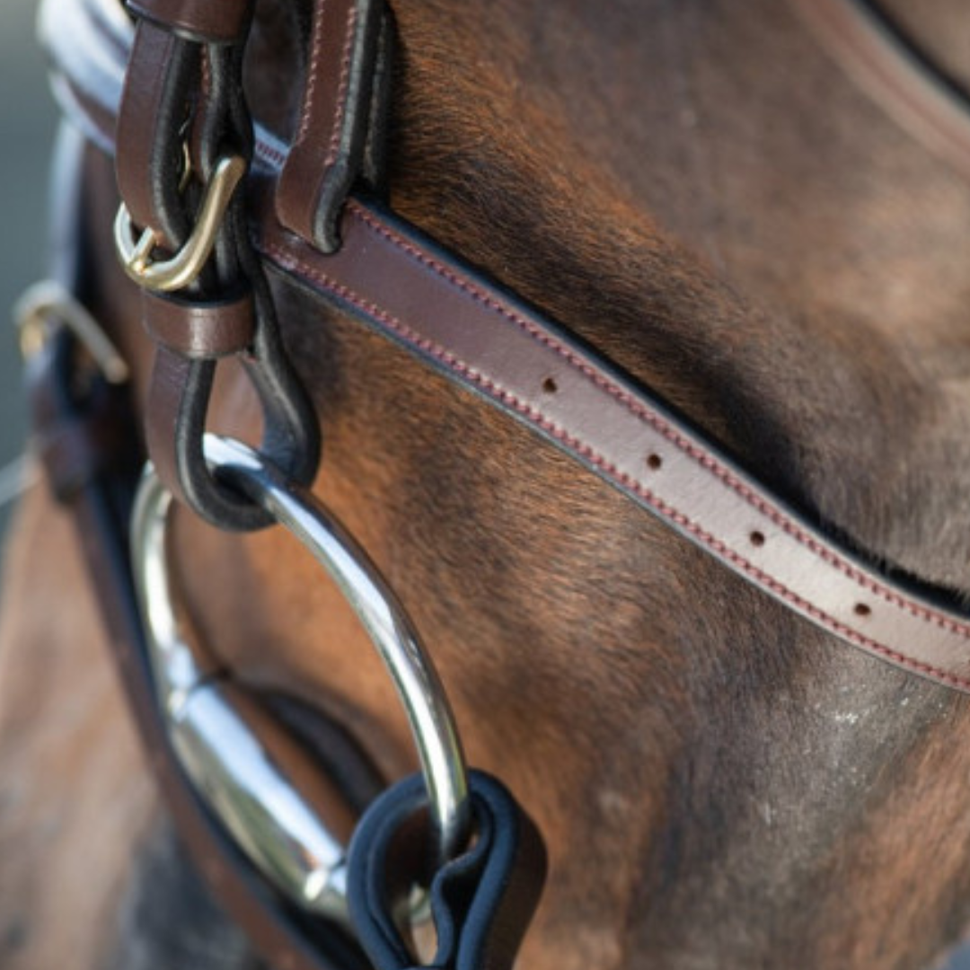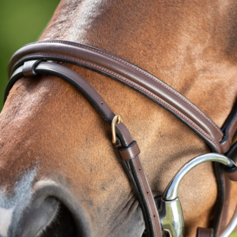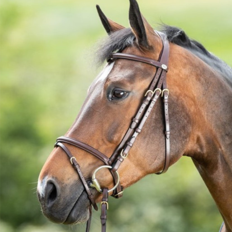 Ce bridon, doté d'une têtière anatomique rembourrée et doublée de cuir souple, assure un confort optimal pour votre cheval. Avec ses surpiqûres ton sur ton et ses rênes 1/2 en caoutchouc souple, il est disponible en marron avec boucles en laiton ou en noir avec boucles chromées