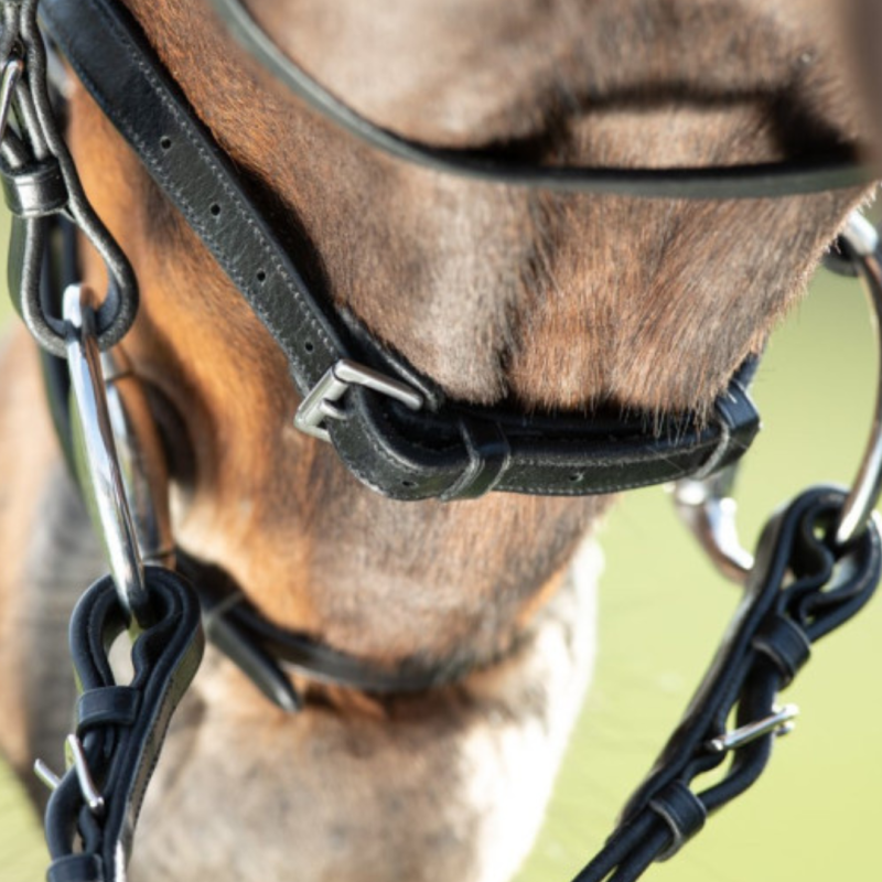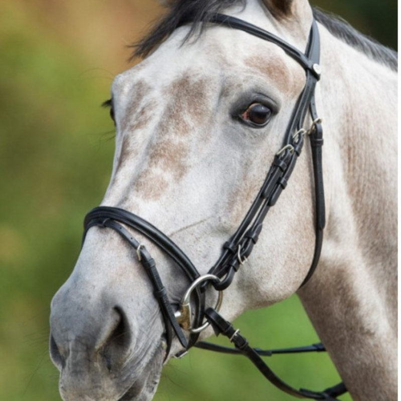 Ce bridon, doté d'une têtière anatomique rembourrée et doublée de cuir souple, assure un confort optimal pour votre cheval. Avec ses surpiqûres ton sur ton et ses rênes 1/2 en caoutchouc souple, il est disponible en marron avec boucles en laiton ou en noir avec boucles chromées. Taille Pony = poney A/B, Cob = poney C/D, Full = poney D/cheval