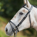 Ce bridon, doté d'une têtière anatomique rembourrée et doublée de cuir souple, assure un confort optimal pour votre cheval. Avec ses surpiqûres ton sur ton et ses rênes 1/2 en caoutchouc souple, il est disponible en marron avec boucles en laiton ou en noir avec boucles chromées