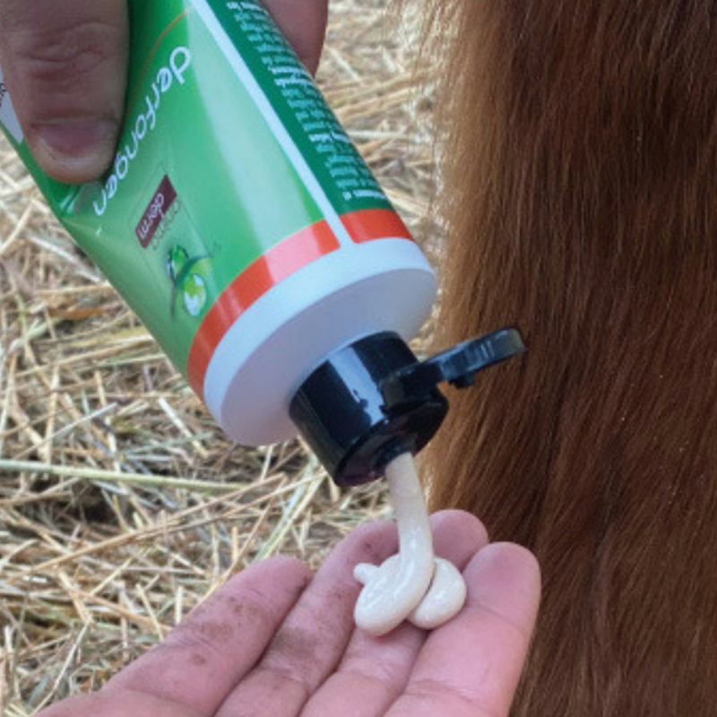 Sans silicone ni phosphate, la lotion Animaderm Derfongen™ est un lait-crème à base d'ingrédients naturels adapté aux chevaux à la peau sensible.