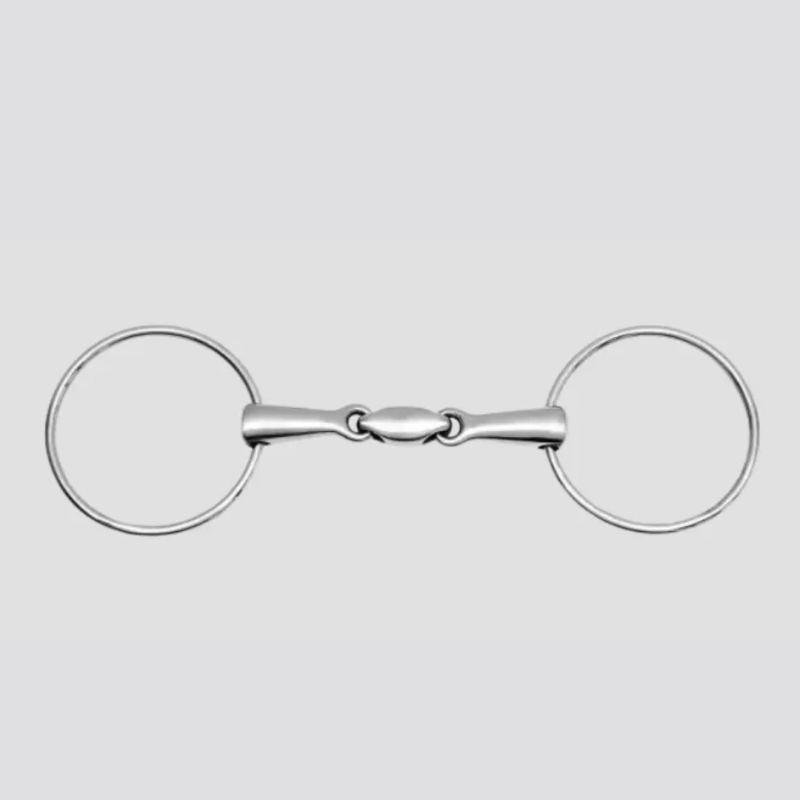 Le mors à double brisure anatomique avec deux grands anneaux offre un contact précis et confortable pour le cheval, idéal pour un travail délicat. Fabriqué en inox, il assure une durabilité et une résistance à la rouille.