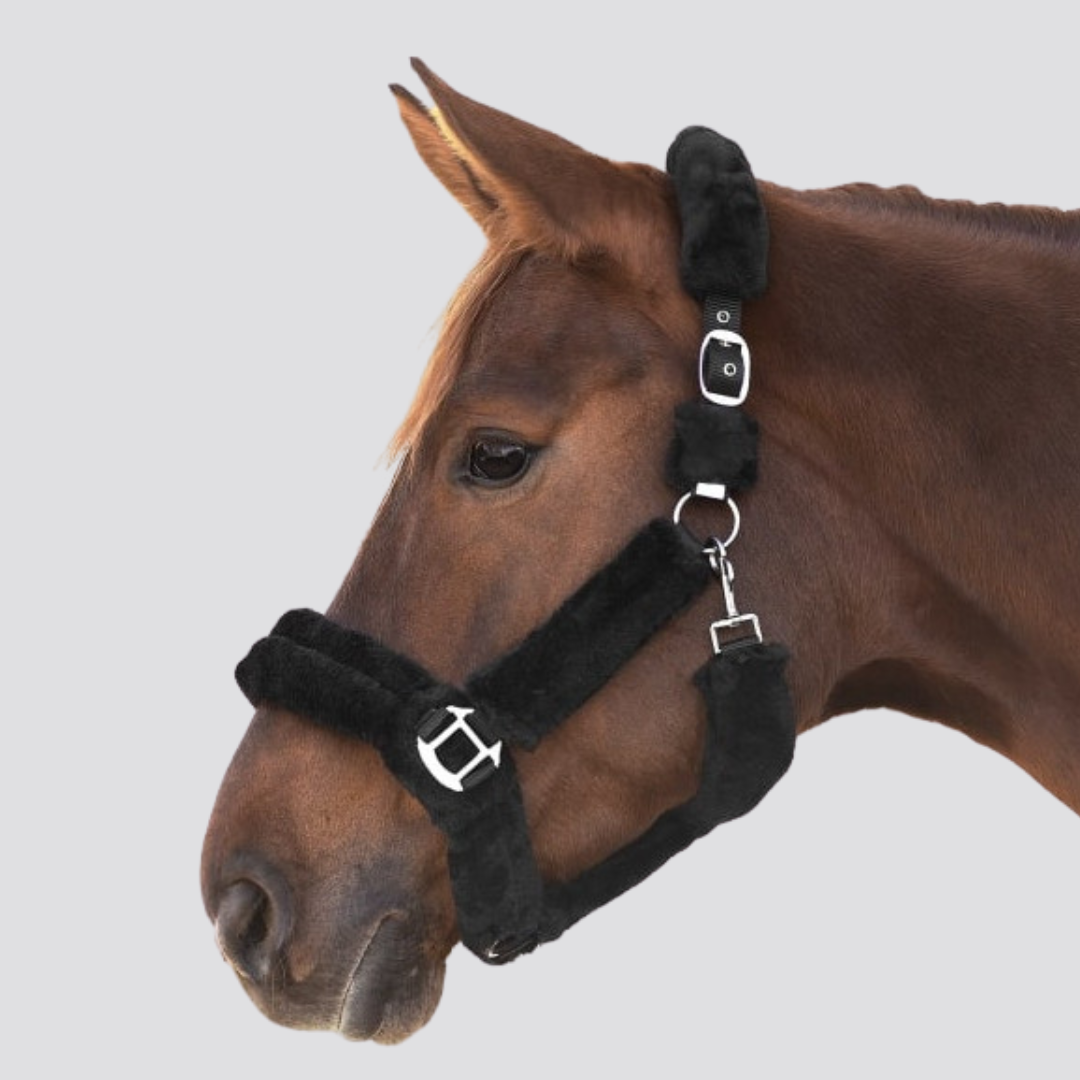Ce licol est doté d'une sangle recouverte de fourrure synthétique, offrant un confort optimal pour les chevaux sensibles, notamment lors du transport. La têtière est réglable des deux côtés pour un ajustement parfait