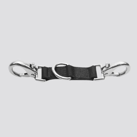 L'alliance mors est équipée de deux mousquetons solides aux extrémités et d'un anneau en D central pour une fixation facile. Idéale pour la longe. Avec une taille de 18 cm, elle est idéale pour les poneys