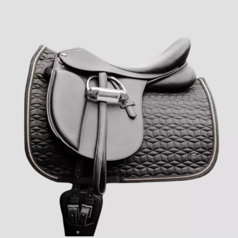 Cette chabraque classique se distingue par sa jolie surpiqûre originale, rehaussée par une petite plaque métallique et deux cordons ornementaux pour une finition élégante. Sa face inférieure fonctionnelle garantit une respirabilité optimale, tandis que la mousse de 10 mm combinée à un rembourrage de 200 g/m² assure une répartition parfaite de la pression, offrant ainsi un confort idéal pour votre cheval.