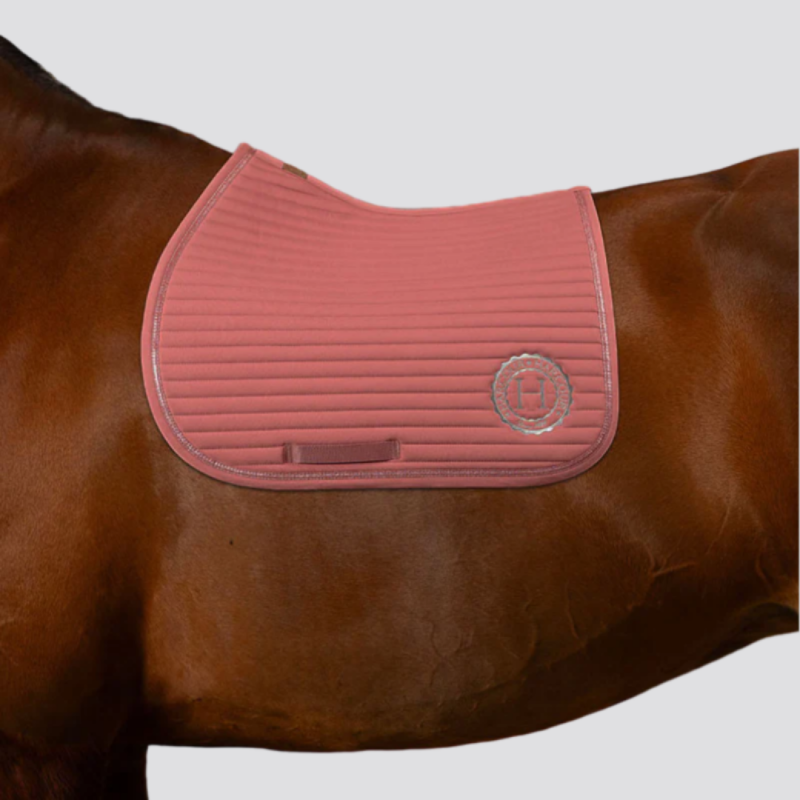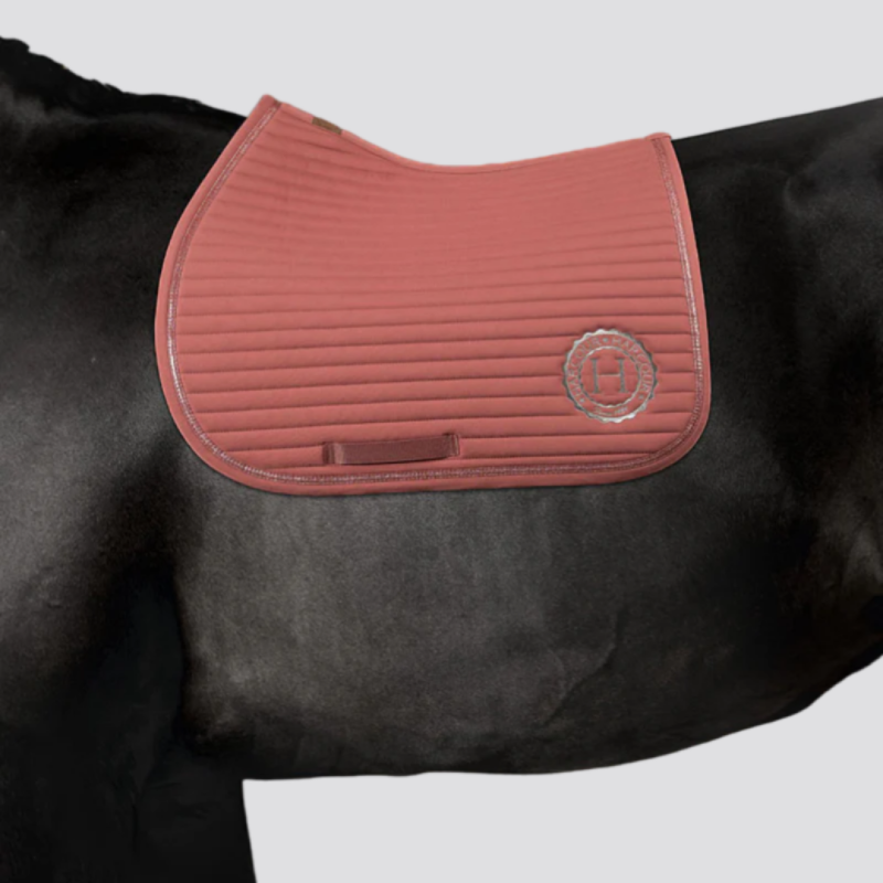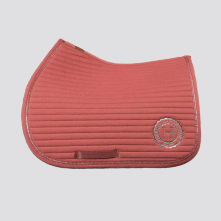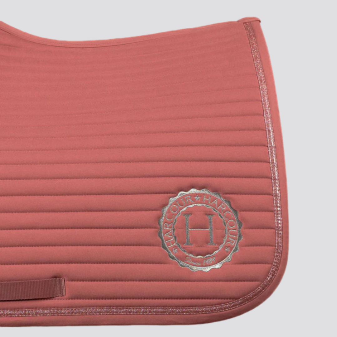 Le tapis de selle Harcour allie robustesse et confort grâce à sa coupe solide qui assure un maintien optimal sous la selle. Sa large dégarrotte s'adapte parfaitement à la morphologie du cheval, tandis que l'intérieur en coton gaufré offre une absorption optimale et une bonne respirabilité. Agrémenté d'un détail de liseré pailleté le long du tapis et d'un matelassage horizontal, il arbore fièrement le logo Harcour sur le côté gauche. Un petit patch en simili-cuir au niveau du garrot et plusieurs passages de sangles assurent une fixation sécurisée lors de l'utilisation