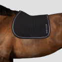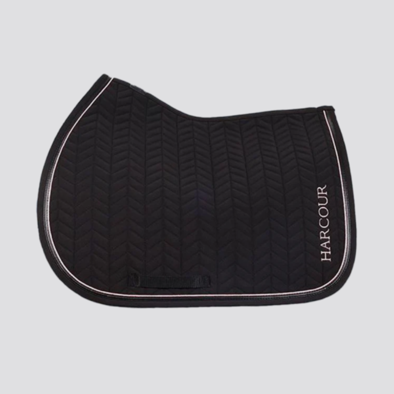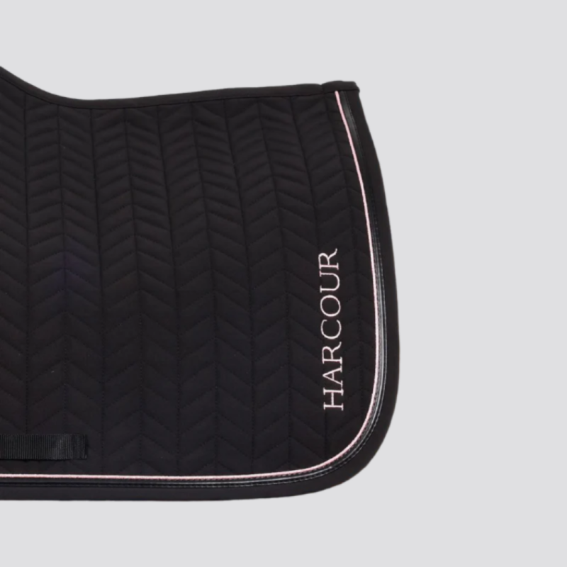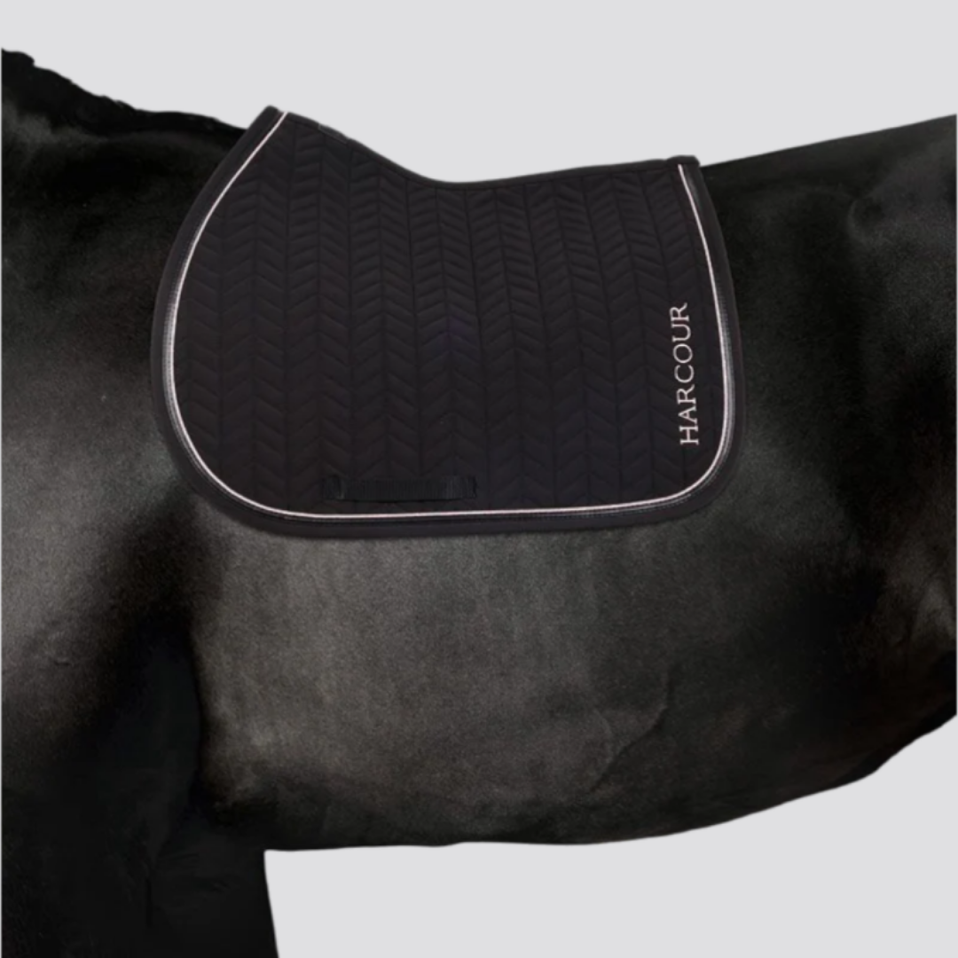 Ce tapis de selle, naturellement dégarrotté, s'adapte parfaitement à toutes les morphologies de cheval. Conçu avec un intérieur en coton gaufré et un rembourrage en polyester, il assure une respirabilité et une absorption optimales. Son liseré plat en faux cuir et son liseré pailleté ajoutent une touche élégante, tandis que le logo Harcour brodé et le patch en simili-cuir au garrot assurent un style distinctif. Équipé de plusieurs passages de sangle, il garantit un maintien sécurisé sous la selle