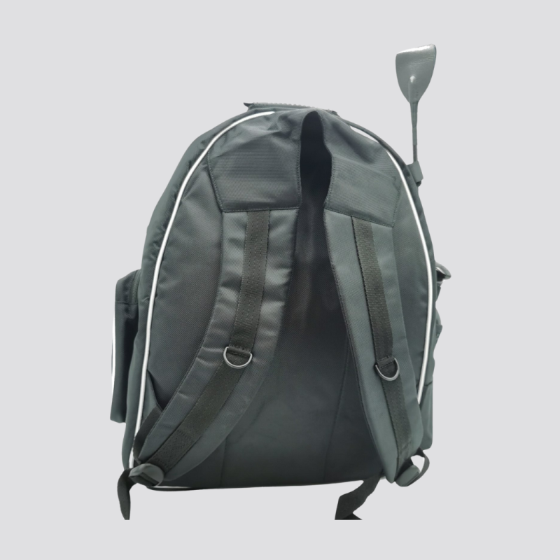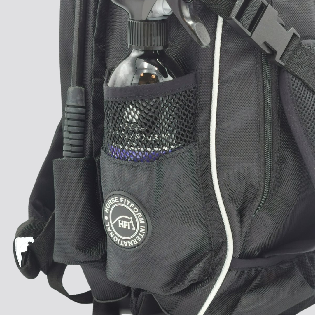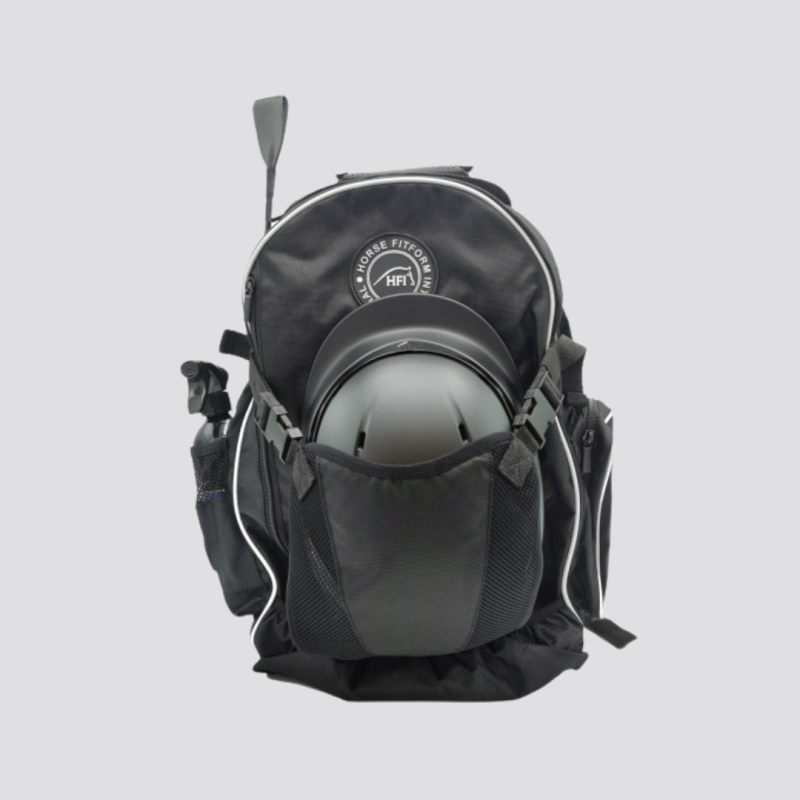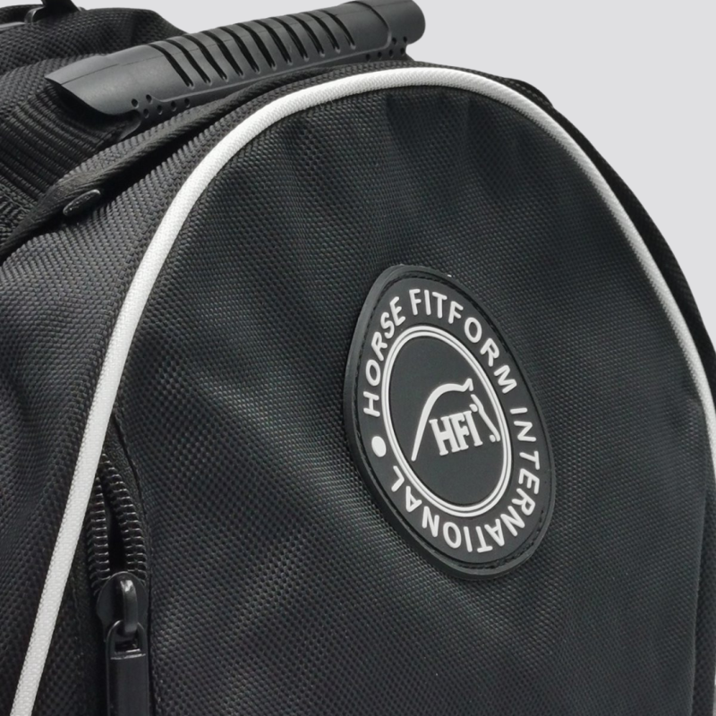 Sac à dos “GROOM” HFI en nylon balistique déperlant, idéal pour les concours. Doté de multiples poches, dont une pour casque, il offre des compartiments pratiques pour organiser tout le matériel du cavalier et de son cheval, assurant une préparation optimale