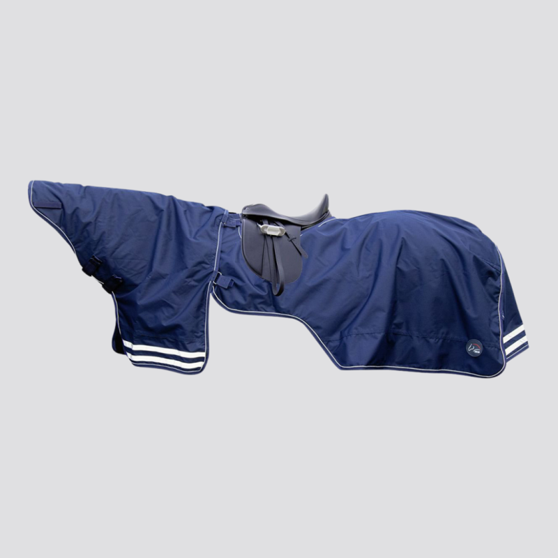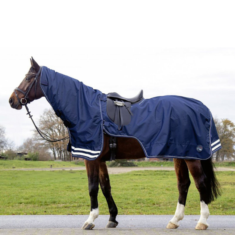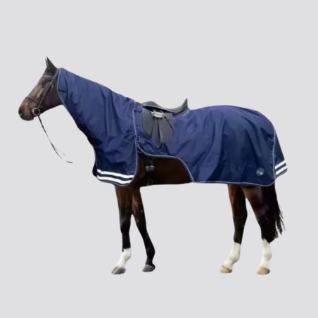 Cette couverture offre une protection complète avec une partie du cou amovible et réglable en largeur, ainsi qu'une courroie de queue et un rabat de queue pour une tenue parfaite. Conçue en polyester résistant 600D avec une doublure en polaire, elle comprend des bandes réfléchissantes pour plus de sécurité et est lavable en machine à 30 degrés (fermer les velcros avant le lavage